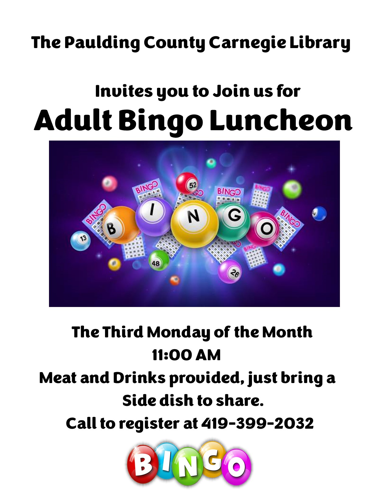Cooper Community Senior BingoSenior Bingo with the Meadows of Kalida, come in and have lunch and play bingo! Mark it on your calendar we host this the second Thursday of each month. Food , Friends and prizes!Location: The Cooper Community Branch Library |