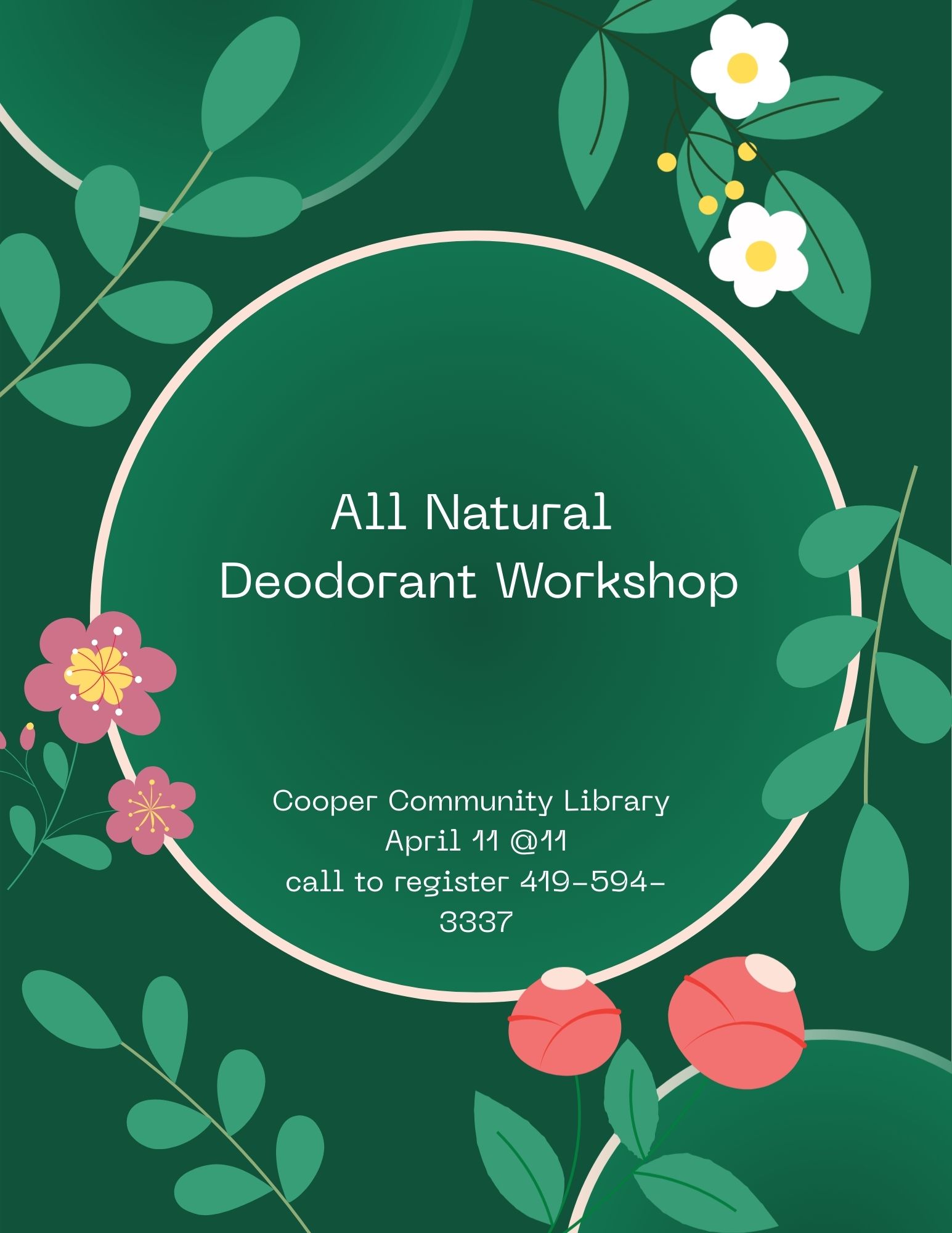 Cooper Community Library All Natural Deodorant WorkshopCall the library to register for our All-Natural Deodorant Workshop and learn how to make your own simple, healthy personal care product. Location: The Cooper Community Branch Library |
