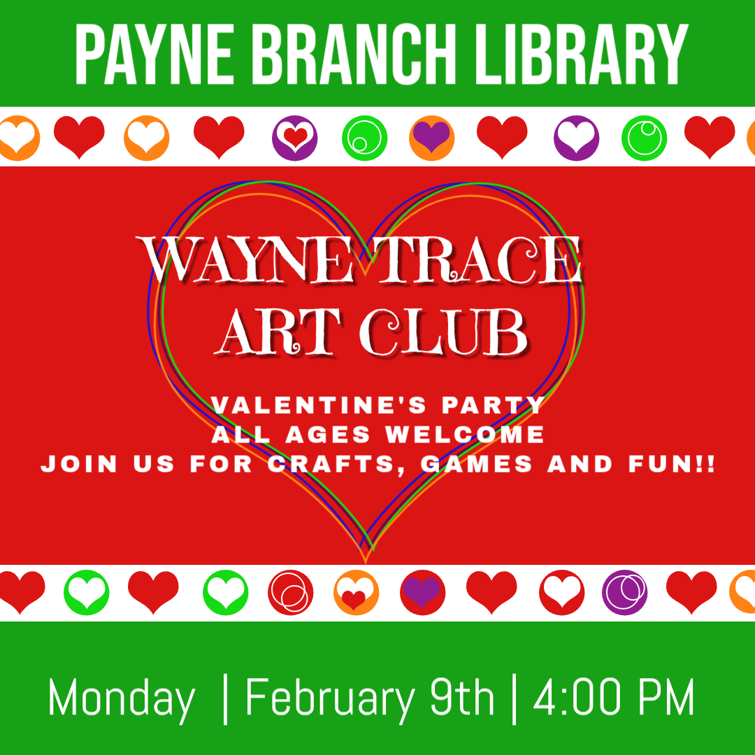 PBL Wayne Trace Art Club Valentine PartyThe Wayne Trace Art Club will be here. Loads of FUN! Games, Crafts and Special Treats.Bring all your Friends! Location: The Payne Branch Library |