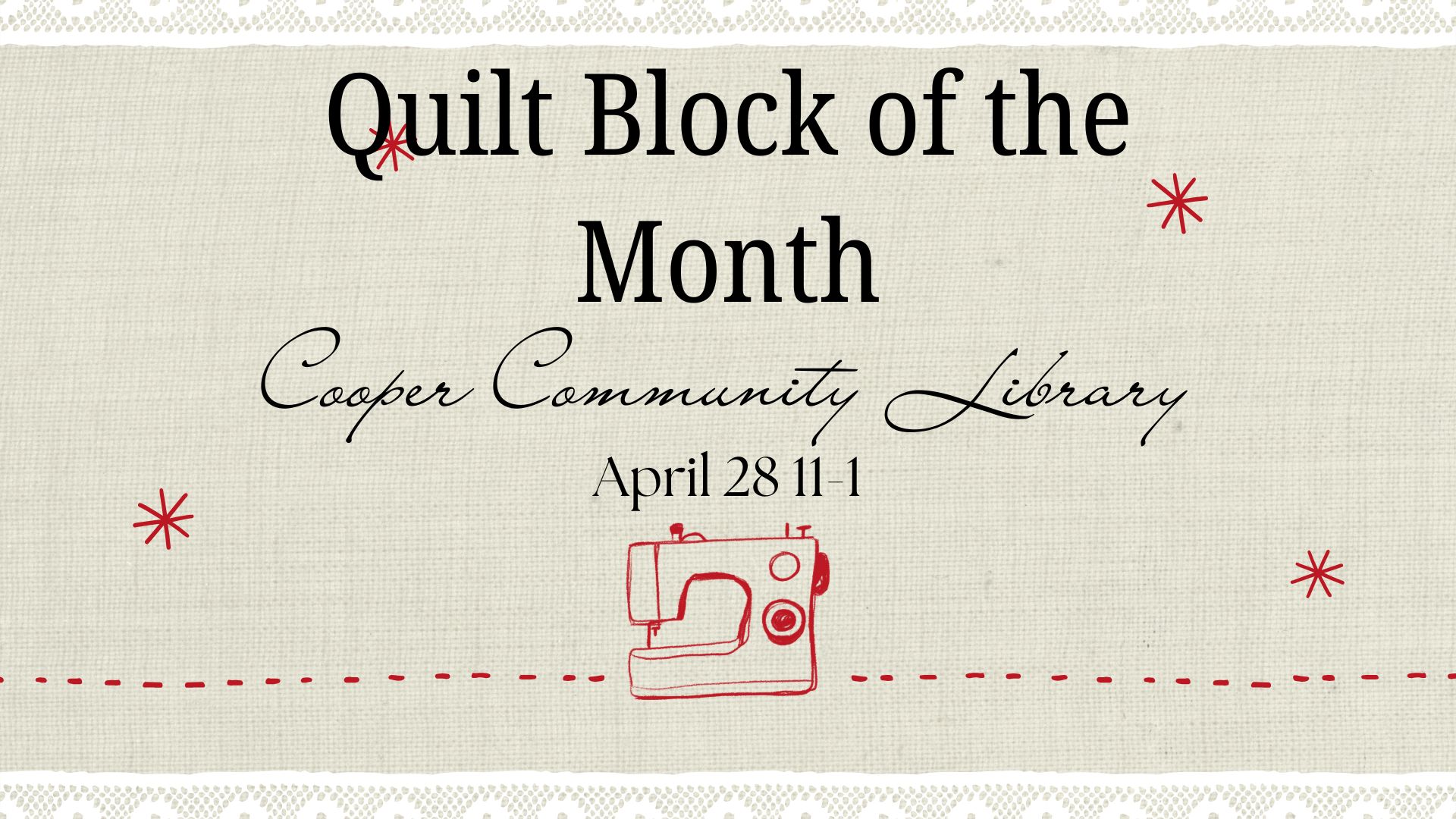 Cooper Community Library Quilt block of the monthJoin us each month to learn a new 12- inch quilt block, with a different design featured each month. This is a fun hands on series perfect for beginners and experienced quilters alike. stop by to pick up your fabric requirements before class. Machines and tools are provided. all are welcome, so come stitch, learn and quilt with us!Location: The Cooper Community Branch Library |