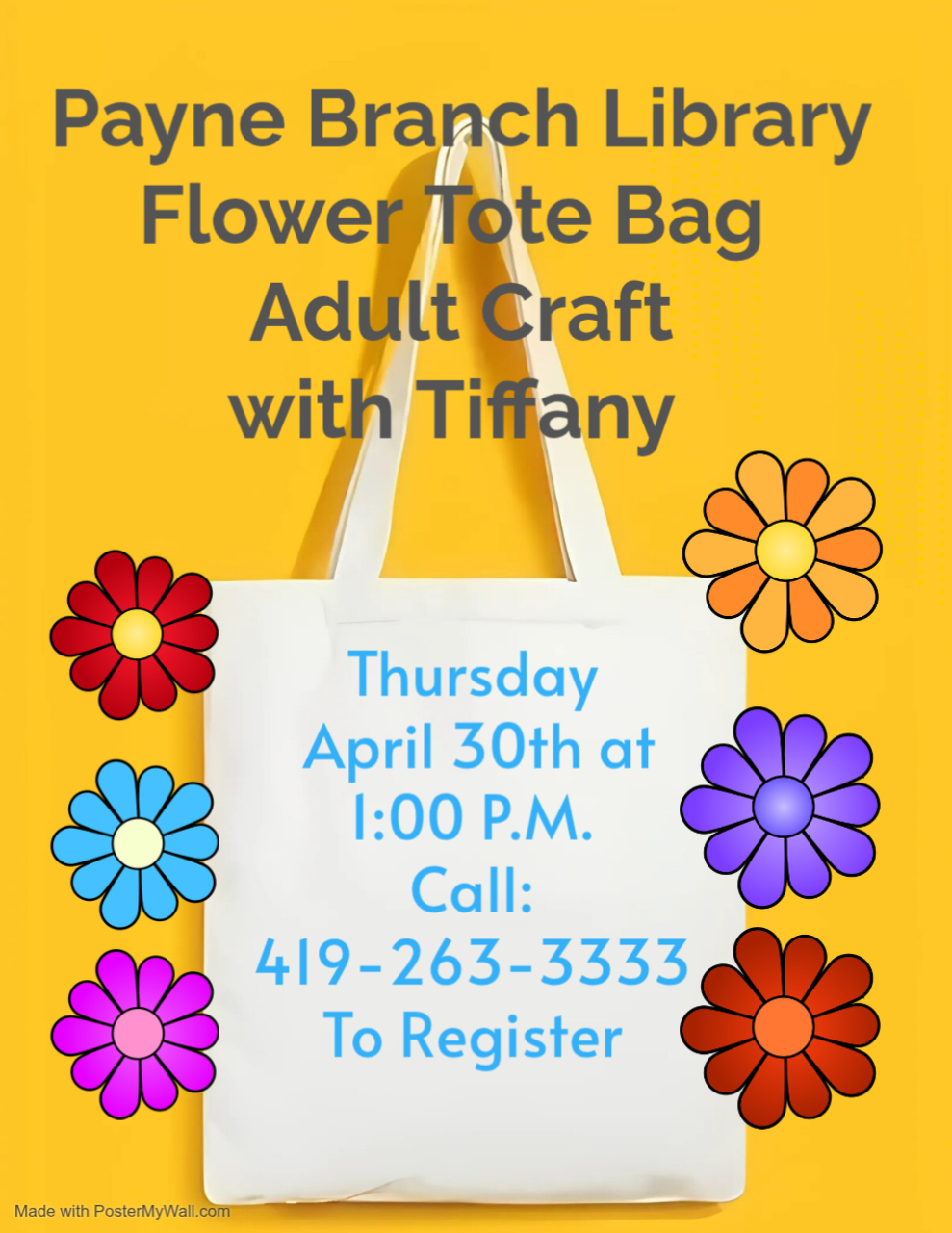 Payne Branch Adult Flower Tote CraftMiss Tiffany will be here to help make a Flower Canvas Tote Bag to Take HomeCall 419-263-3333 To Register. Tell your Friends! Location: The Payne Branch Library |